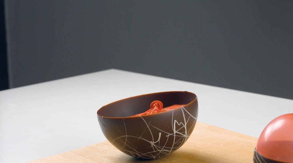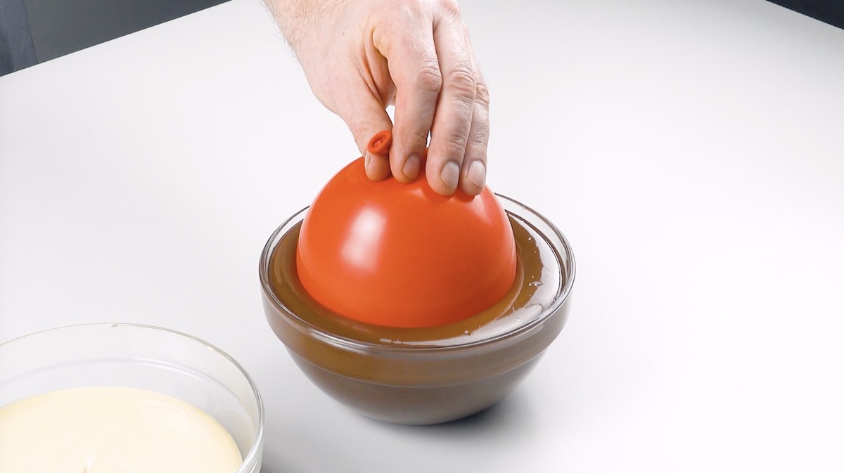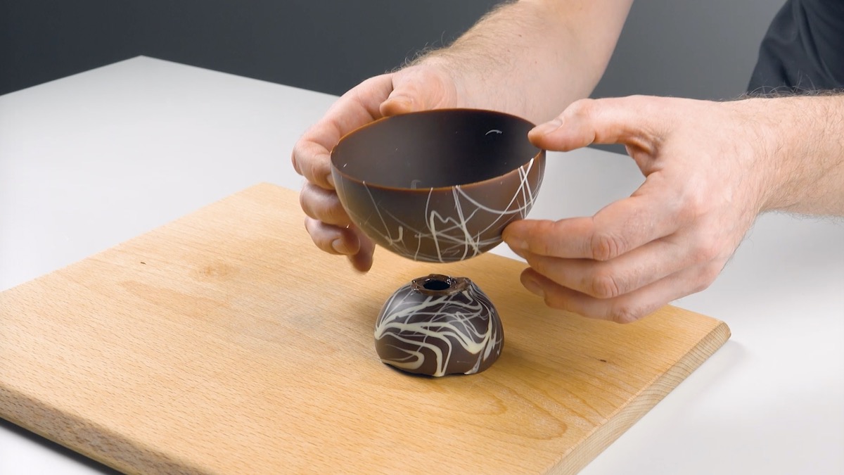 6.) Klebe die Schalen nun zusammen, indem du die Unterseite einer Schale so lange erwärmst, bis die Schokolade wieder zu schmelzen beginnt und du die andere Schale draufkleben kannst.