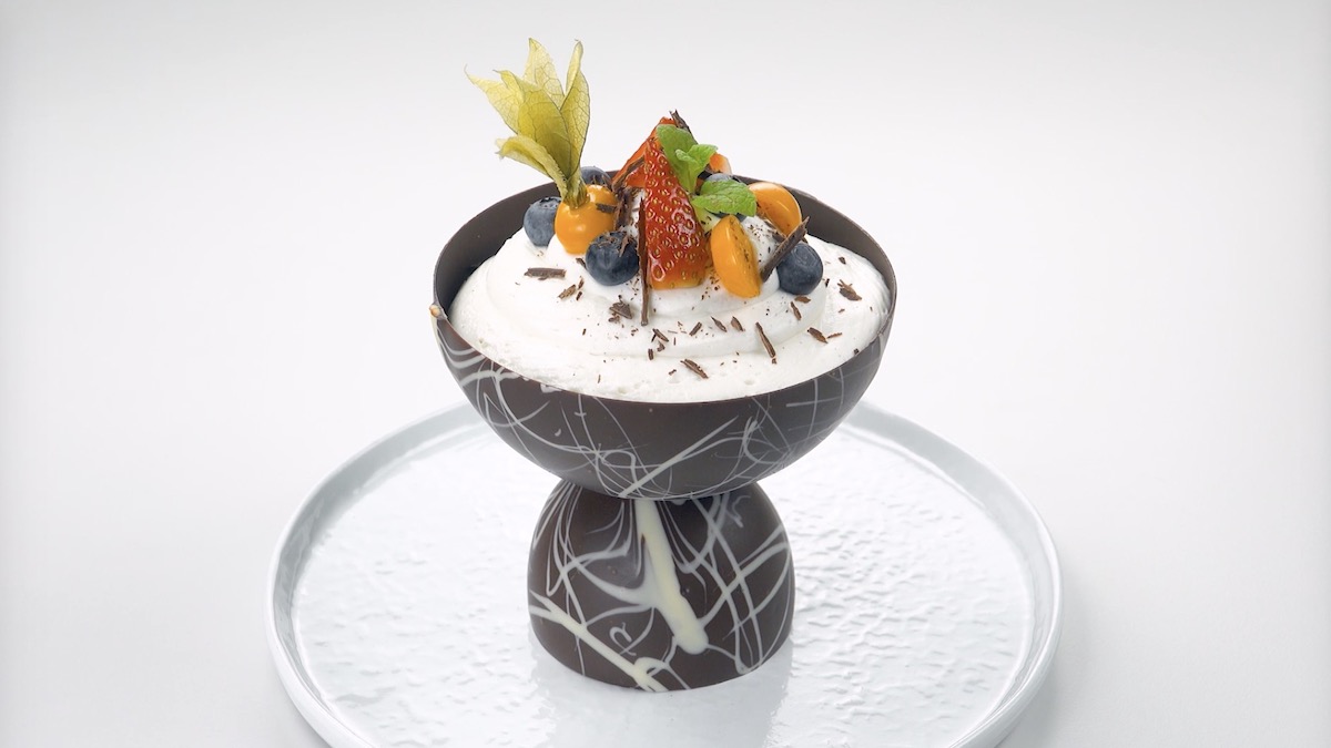 7.) Nun musst du die Schalen nur noch mit einem Dessert befüllen. Wie wäre es beispielsweise mit weißer Schokocreme, Beeren und Schokoraspel, …