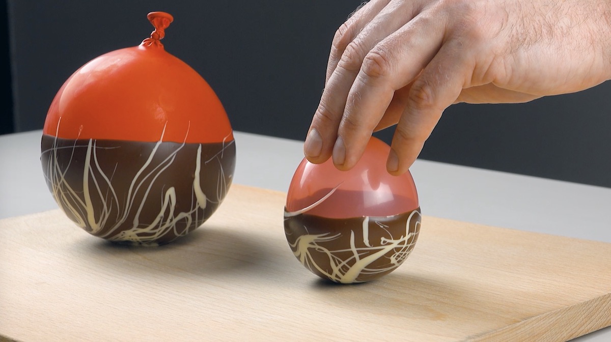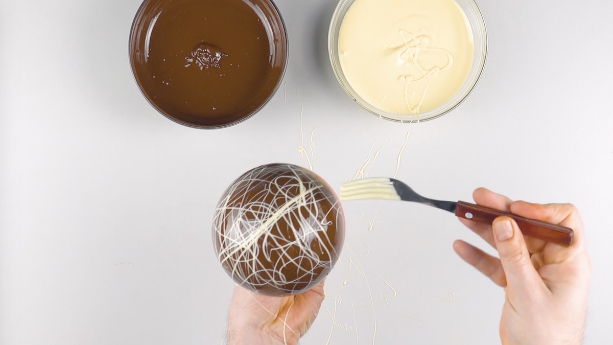 3.) Lass die dunklere Schokolade etwas abtropfen. Tauche dann eine Gabel in die hellere Schokolade, drehe den Luftballon so herum, dass die Schokolade nach oben zeigt, und verteile die hellere Schokolade mithilfe einer Gabel und schneller Bewegungen aus der Luft darüber.