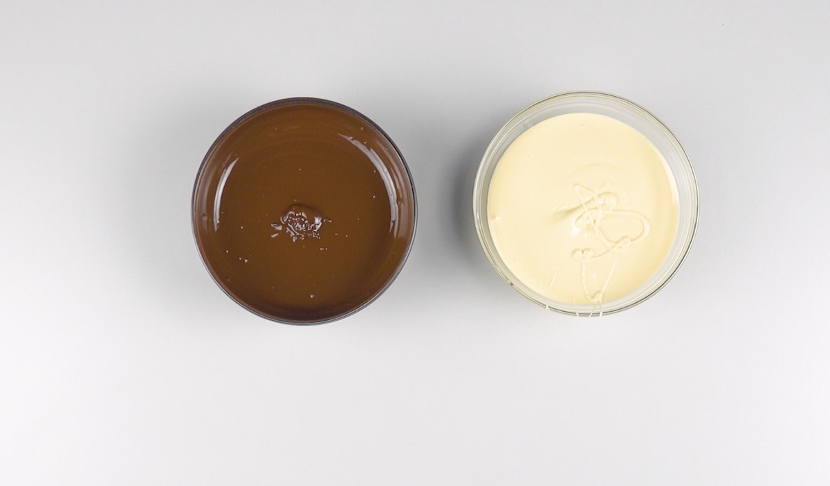 So geht es: 1.) Schmilz die Schokolade in einem Wasserbad. Wir empfehlen, für jede künftige Schale mindestens zwei verschiedene Schokoladensorten zu benutzen, um die Schalen verzieren zu können.