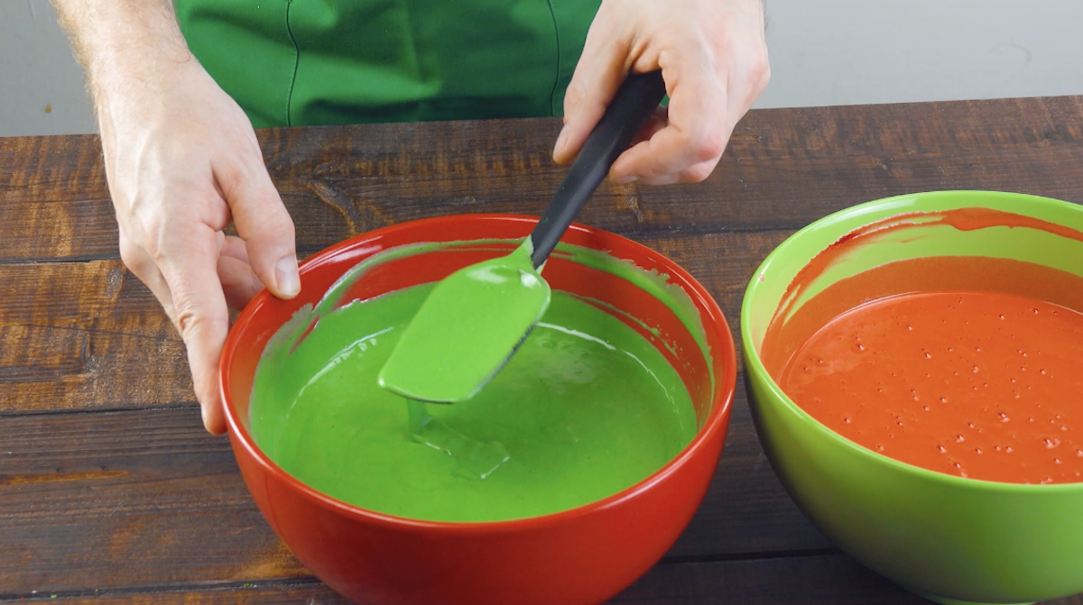 1. Schlage die Eiweiße auf und gib nach und nach Zucker hinzu. Schlage alles zu einem festen Baiser auf. Arbeite dann jeweils separat das Mehl, die Milch und das Öl unter und vermische alles gut miteinander. Teile den Teig auf zwei Hälften auf und färbe eine mit roter und die andere mit grüner Lebensmittelfarbe ein.
