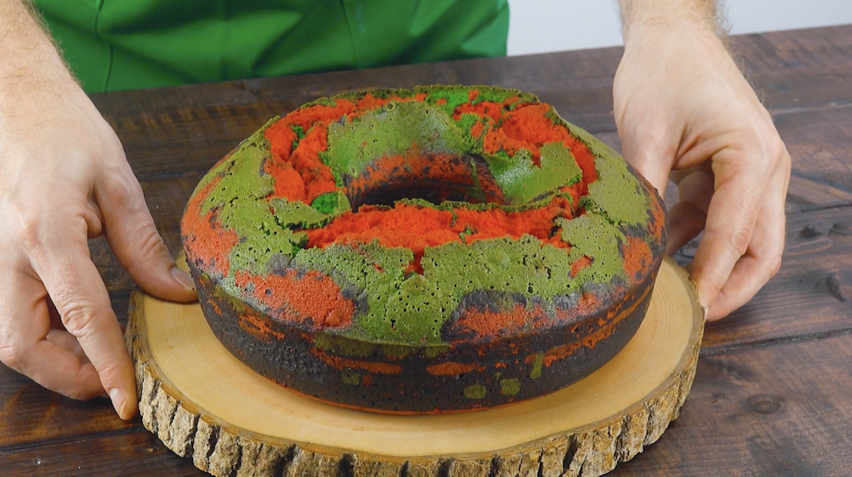 3. Gib die Kuchenform für 1 Stunde bei 170 °C Ober- und Unterhitze in den Backofen (die Stäbchenprobe zeigt dir, ob der Teig gar ist). Lasse den Kuchen nach dem Backen vollständig auf Raumtemperatur abkühlen. Das dauert ca. 2 bis 3 Stunden.
