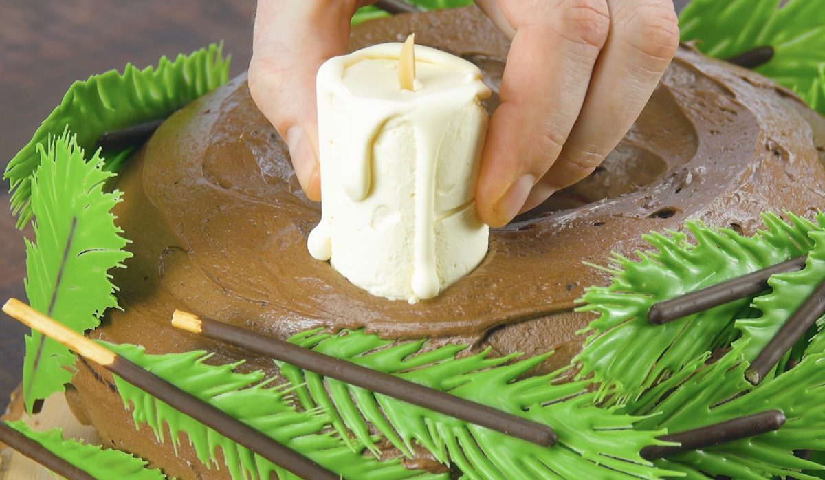 5. Kommen wir nun zu den essbaren Kerzen (die Herstellung wird im Video nicht gezeigt). Schmilz die gehackte, weiße Schokolade in heißer Sahne. Vermische alles gut miteinander und lasse es auf Raumtemperatur abkühlen. Gib nach und nach Butter hinzu. (Wichtig: Schokocreme und Butter müssen in etwa die gleiche Temperatur haben).