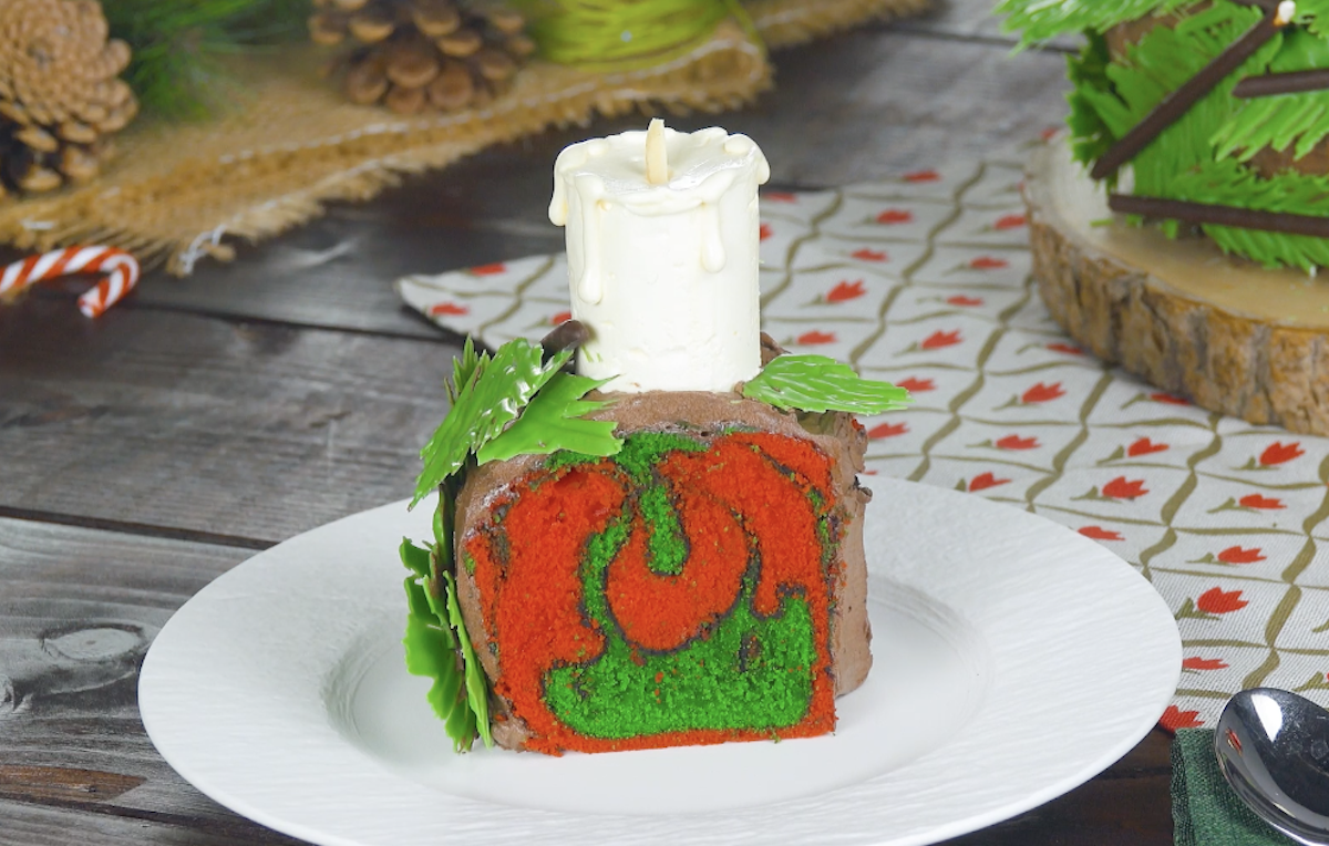 6. Für die Pinienzweige färbst du geschmolzene weiße Schokolade grün ein. Verteile die Schokolade auf einem länglichen Stück Backpapier und streiche sie von der Mitte aus mit zwei Gabeln jeweils nach links und nach rechts außen. Lege außerdem ein Mikado-Stäbchen in die Mitte. Lasse die Schokolade anziehen und dann im Kühlschrank aushärten. Löse den Zweig zum Schluss vorsichtig vom Backpapier.