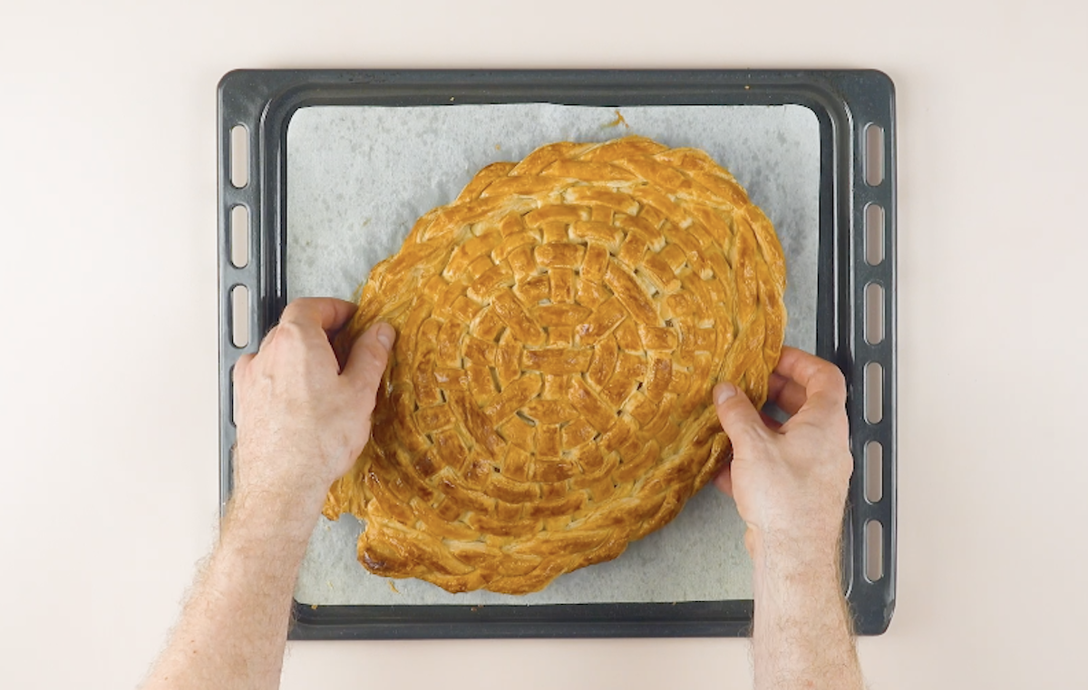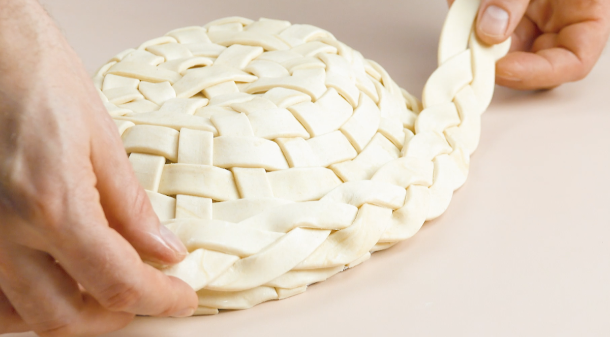 2. Schneide den Blätterteig in ca. 1,5 cm breite Streifen. Wende dann die Flechttechnik aus dem Video an und verflicht alles miteinander. Der Korb besteht aus insgesamt 4 Bauteilen: dem großen „Unterteil“, den zwei geflochtenen Zöpfen für einen stabileren Rand und dem geflochtenen Zopf für den Henkel. „Klebe“ die 2 geflochtenen Zöpfe an den Rand des Unterteils. Hilf hier ein bisschen mit Wasser nach, damit die einzelnen Streifen auch aneinander haften bleiben.
