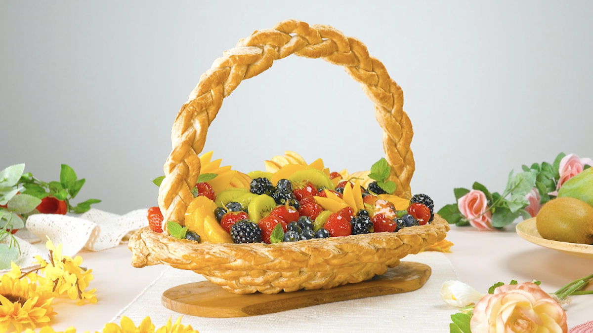Wer hat schon einmal einen Obstkorb geschenkt bekommen? Meistens handelt es sich dabei um einen geflochtenen Korb, der bis zum Bersten mit den unterschiedlichsten Früchten gefüllt ist. Aber wie wäre es denn mit einem Obstkorb, den man komplett essen kann? Also auch den Korb an sich! Unser Obstkorb besteht nämlich aus knusprigem Blätterteig. Gefüllt ist der Korb mit einer köstlichen Mascarponecreme und allerlei Obst.