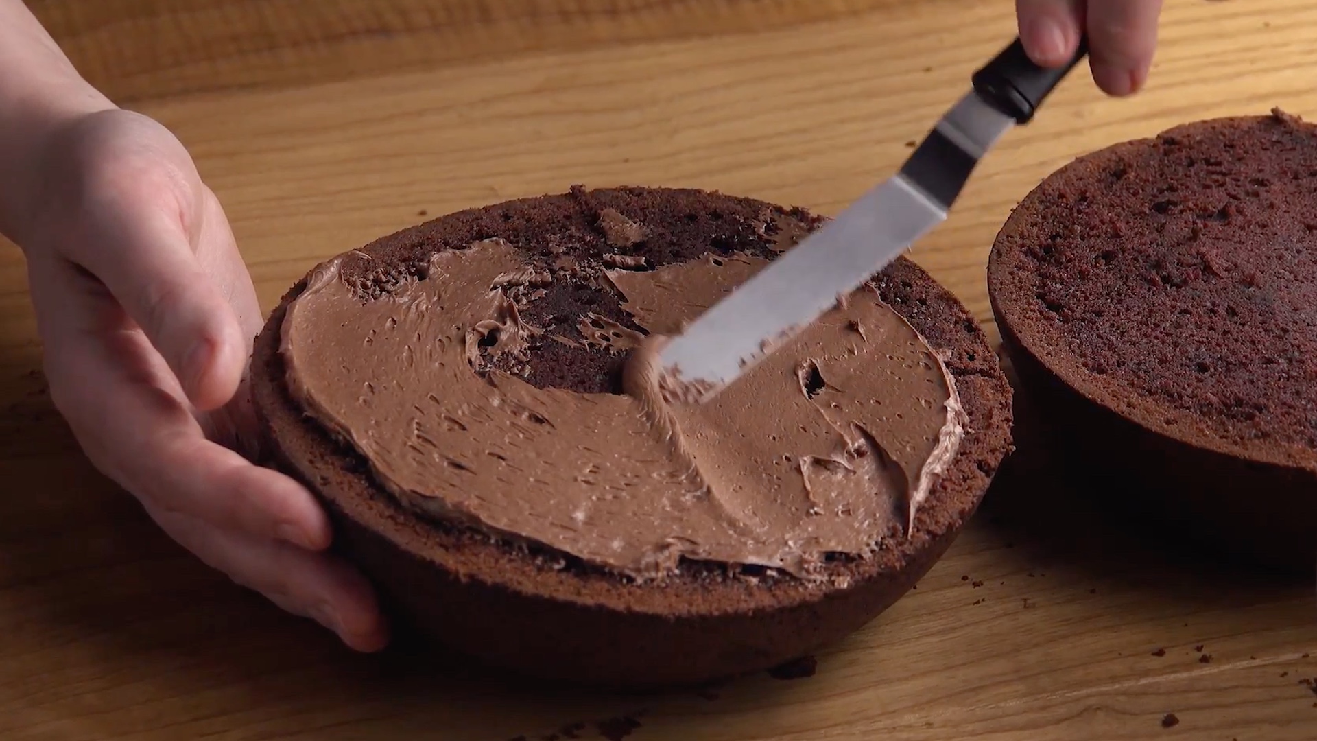 6.) Bestreiche die Schnittfläche auf der zusammengesetzten Kugel ebenfalls mit Nutella-Buttercreme und setze den dritten Kuchen aus der Springform auf.
