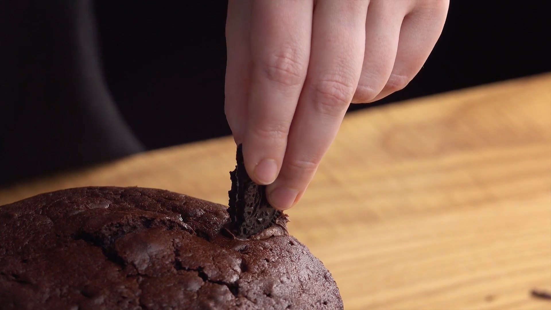 8.) Teile die Oreo-Kekse und brich je zwei Kekse ohne Creme in Hälften. Klappe die Hälften zusammen, tauche ein Ende in die Nutella-Buttercreme und drücke die Kekse in den obersten Kuchen, um der Eule Ohren zu geben.