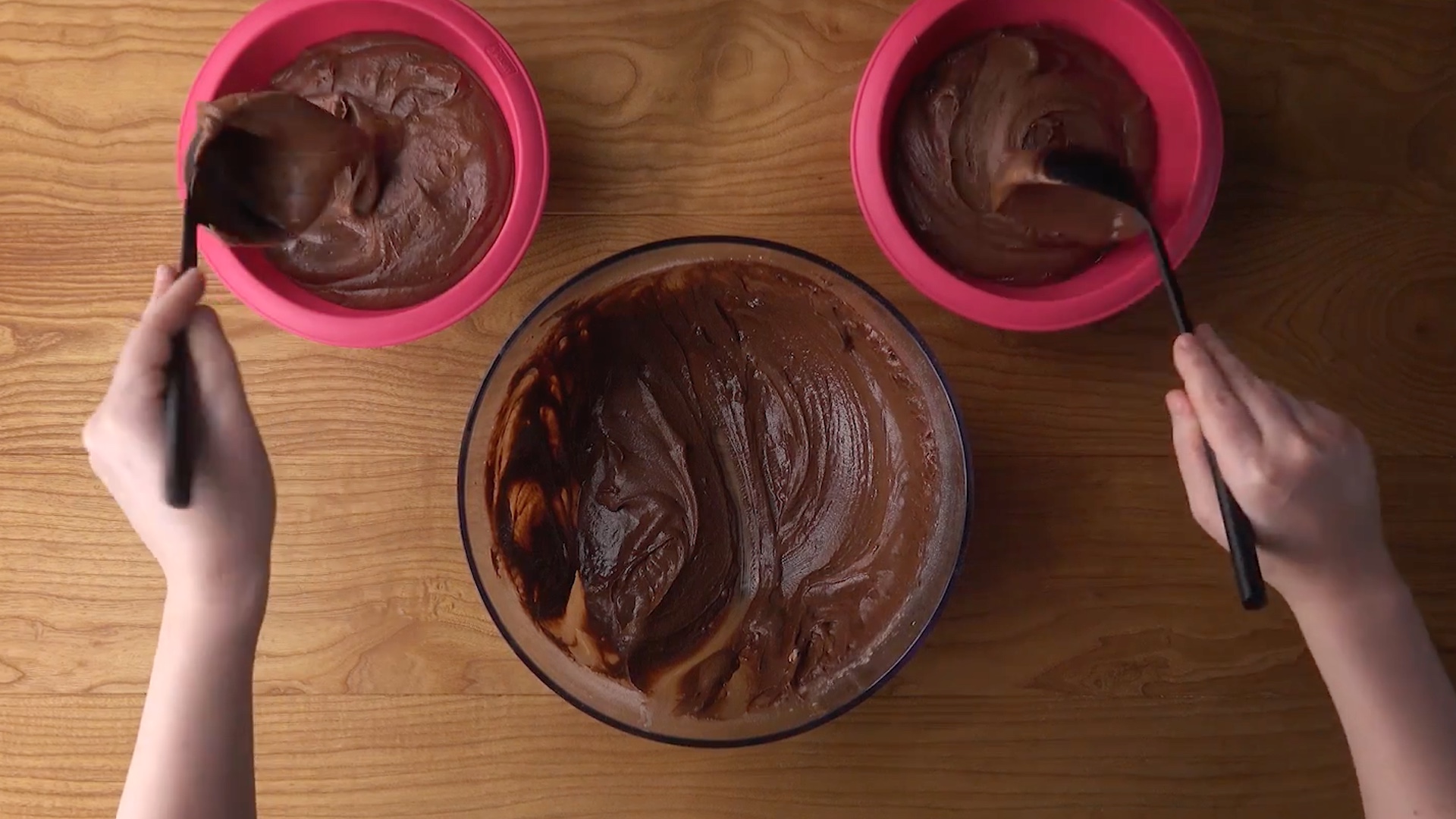 2.) Teile den Teig in drei Portionen. Zwei Portionen gibst du in je eine halbkugelförmige Backform. Das letzte Teigdrittel füllst du in eine kleine Springform (Durchmesser: 16 Zentimeter). Bei 170 °C (Umluft) werden die Kuchen für 45 Minuten gebacken.