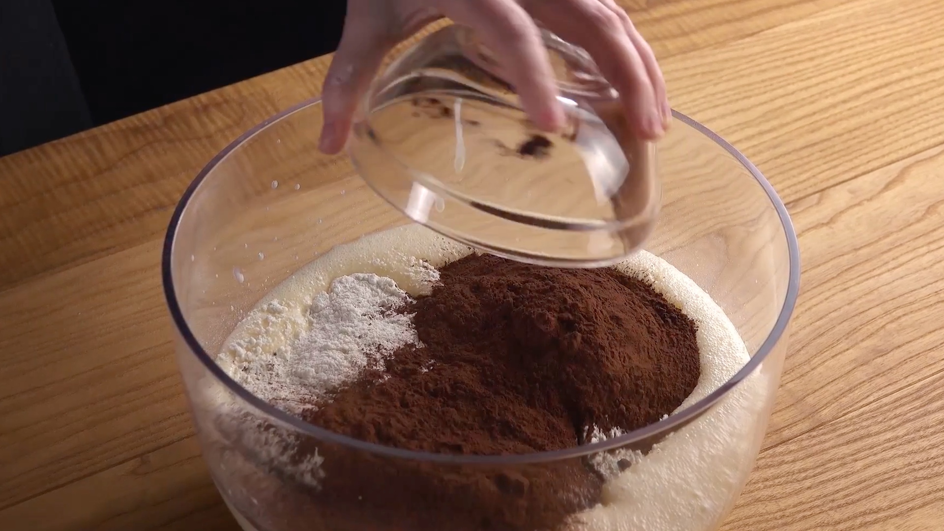 1.) Schlage Eier und Zucker mit einem Handrührgerät schaumig. Gib Buttermilch, Vanillearoma, Mehl, Kakaopulver, Backpulver und Salz zum Teig und mische ihn gründlich. Erst zum Schluss gibst du die Butter dazu und mischst den Teig ein letztes Mal.