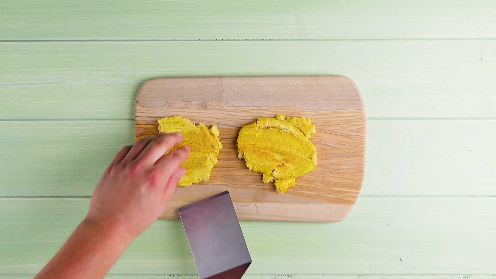 2.2) Nun kommt der interessante Teil: Beide Bananenhälften werden auf deiner Arbeitsfläche z.B. mit einem kleinen Schneidbrett plattgedrückt. Diese „Buns” werden nun noch einmal kurz im Öl frittiert und dann mit einer Schöpfkelle abgeschöpft.