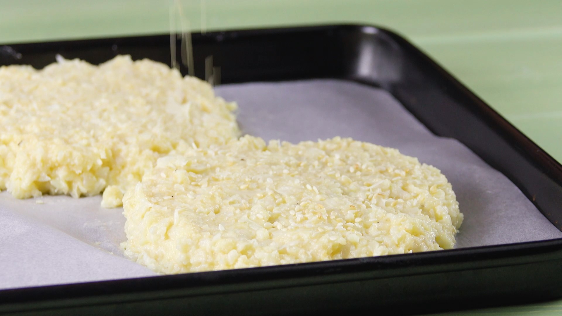 Forme aus dieser Masse vier gleich große runde Platten und lege diese auf ein mit Backpapier ausgelegtes Backblech. Danach werden die „Buns” mit Sesam bestreut.