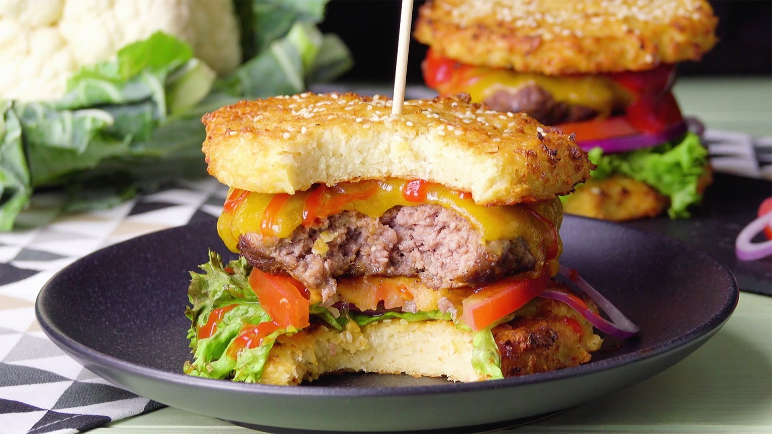 1.4.) Nun wird der Burger zusammengesetzt: Dafür legst du einen Blumenkohl-Bun auf den Servierteller und belegst ihn mit Salat und Zwiebelringen. Darauf kommen eine Tomatenscheibe und der Burgerpatty. Gib auf den Patty noch nach Belieben Ketchup. Zuletzt kommt ein weiterer Bun mit Sesam auf der Oberseite obendrauf.