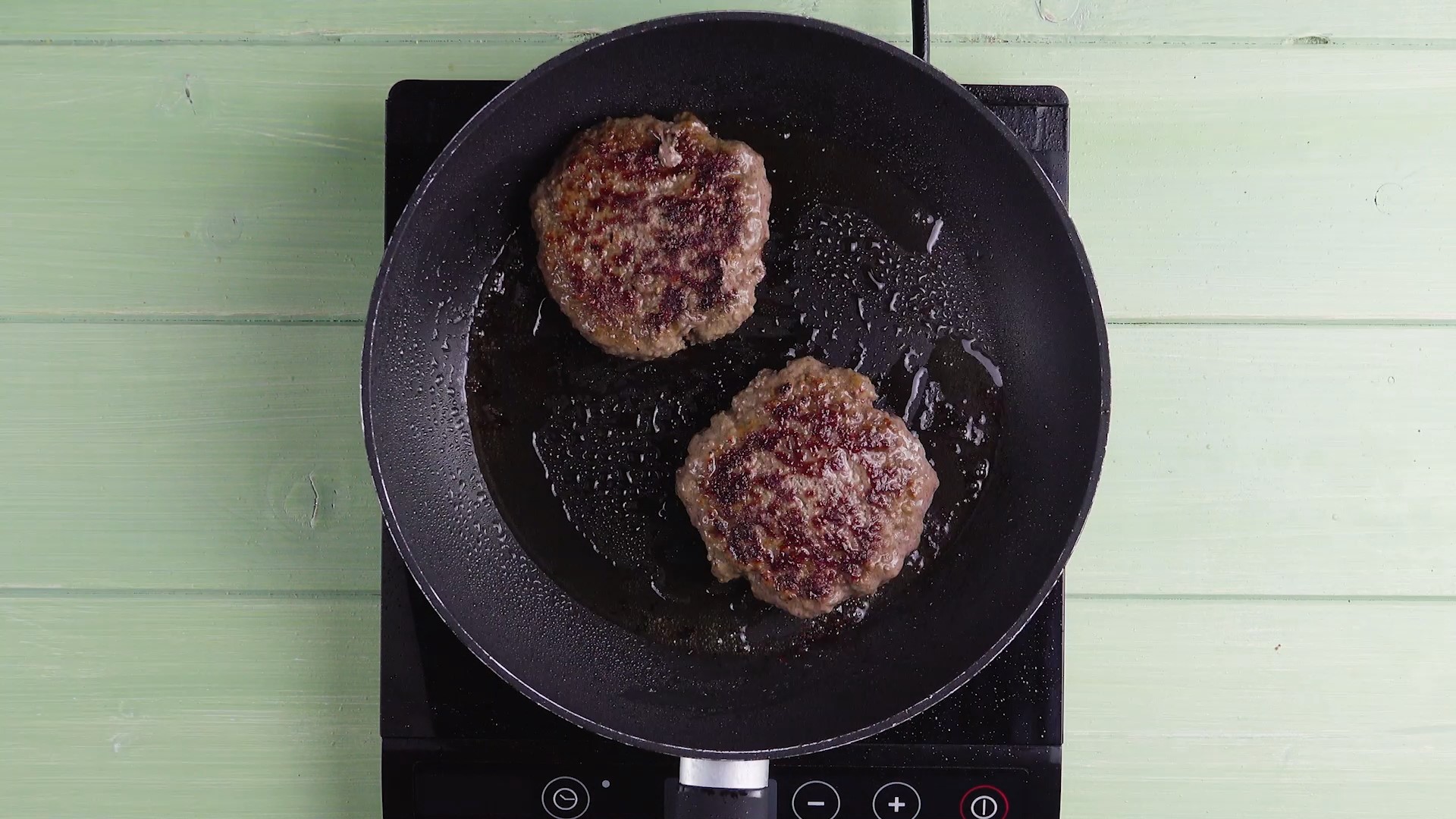 1.3) Für den Burgerpatty würzt du zuerst das Hackfleisch mit Salz und Pfeffer, formst dann zwei Pattys daraus und brätst diese in etwas Öl goldbraun.
