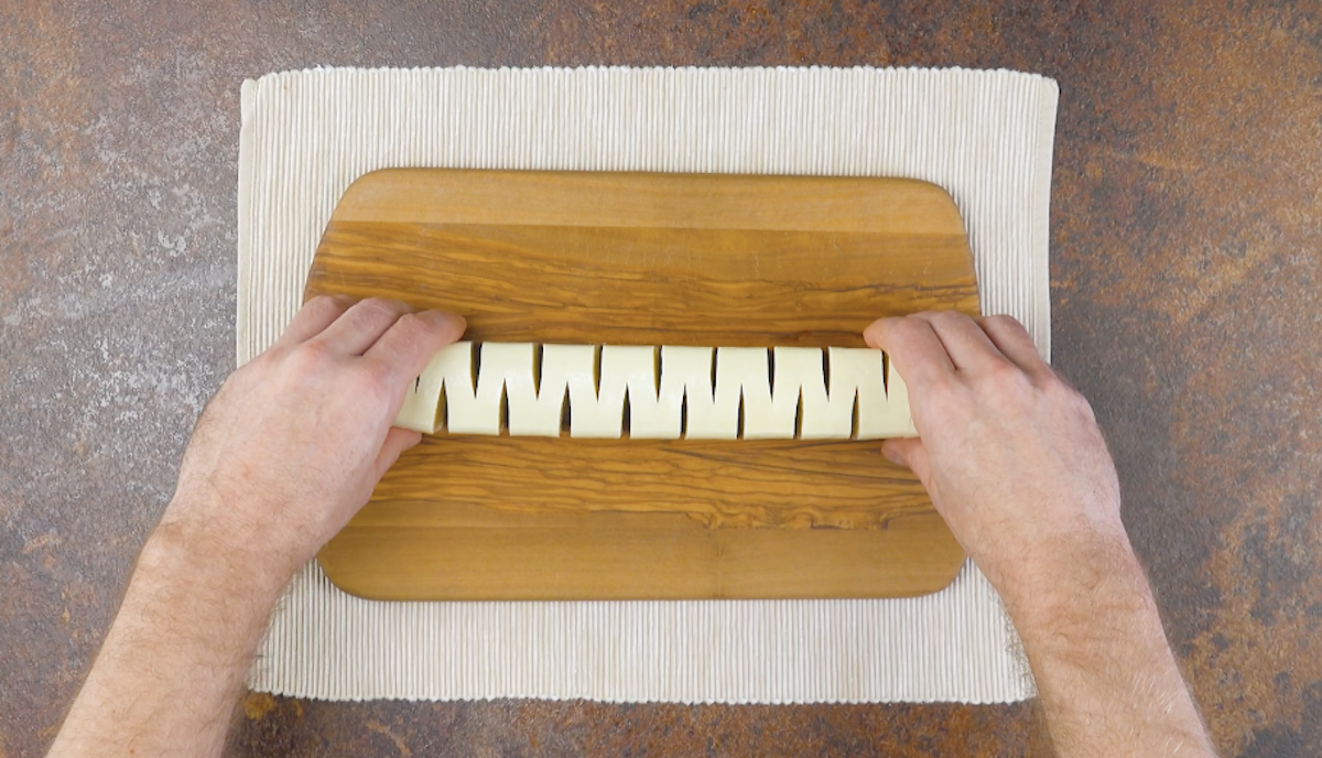 4. Lege den Mozzarella so auf ein Brett, dass die Einschnitte beider Seiten zu sehen sind. Ziehe den Mozzarella wie eine Ziehharmonika vorsichtig auseinander, sodass sich die Einschnitte ein wenig öffnen.