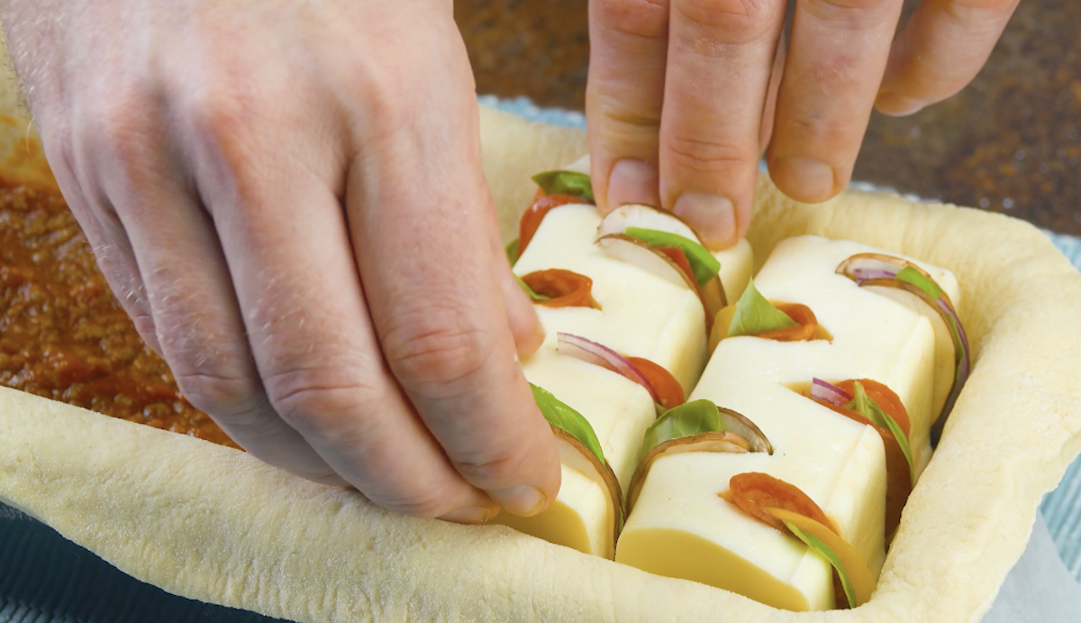 5. Fülle die Einschnitte auf beiden Seiten unterschiedlich: a) mit Basilikum, Salami und gelber Paprika, b) mit Champignons, Basilikum und roter Paprika und c) mit Basilikum, Tomate und Zwiebel.