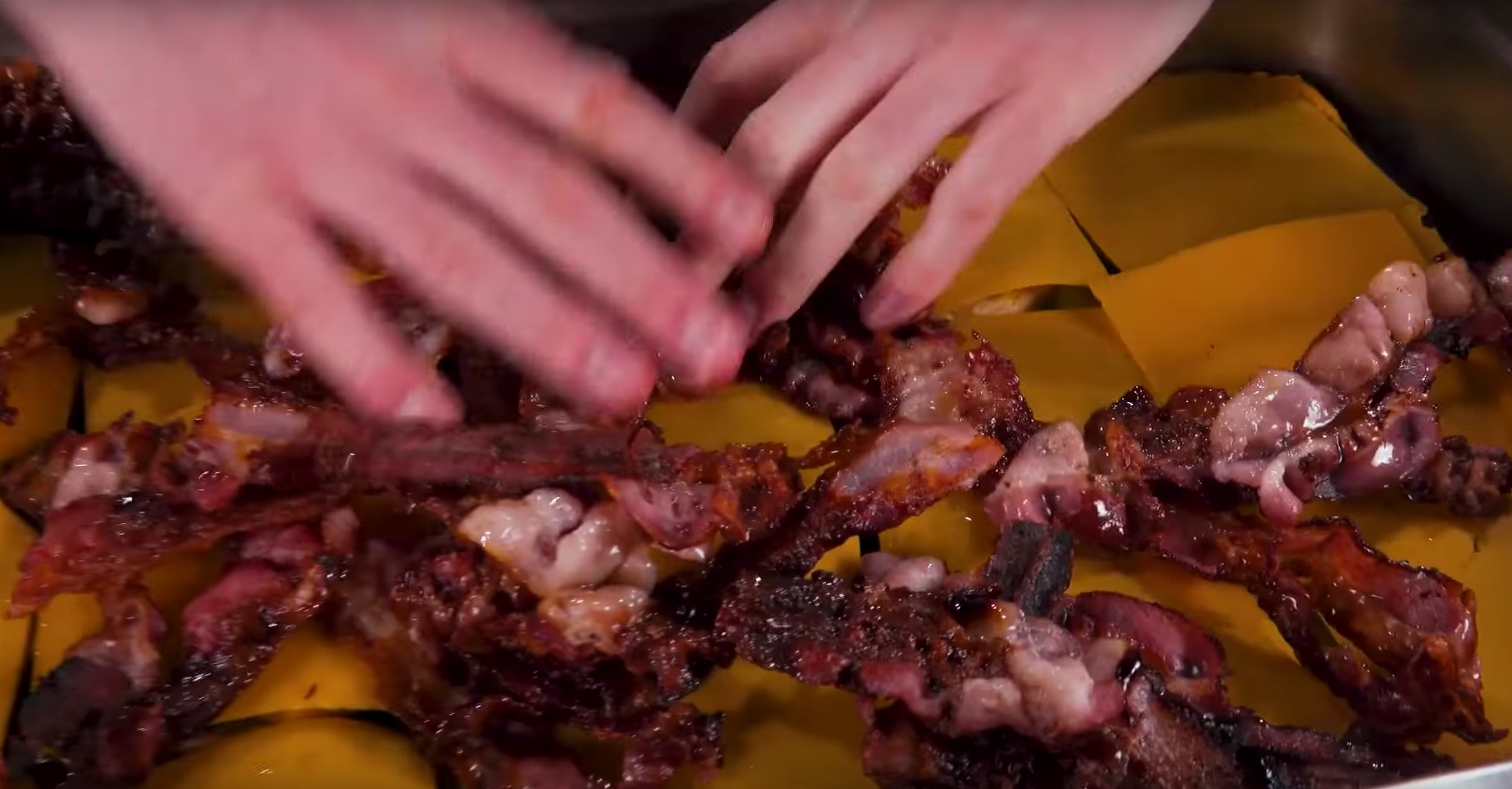 Belege jeden Burger jetzt mit jeweils ein bis zwei Scheiben Käse. Verteile dann die gebratenen Baconscheiben darauf.