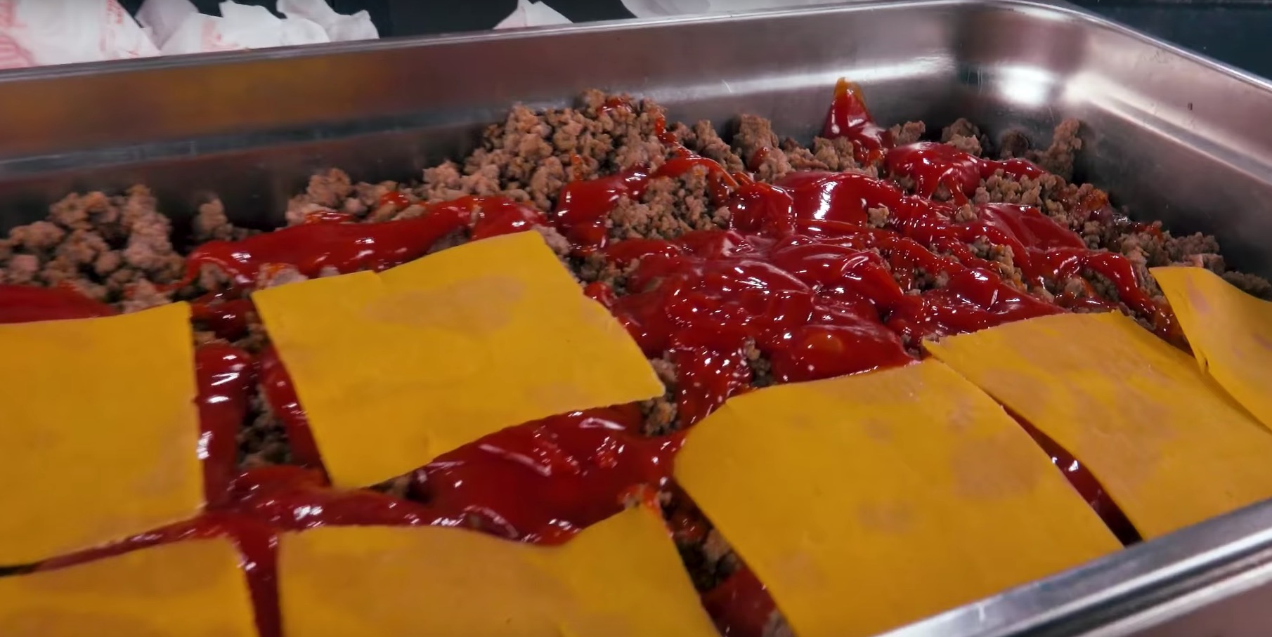 Brate jetzt das Hackfleisch in einer großen Pfanne in Öl an und verteile es anschließend ebenfalls in der Auflaufform. Gib nun den Inhalt der Ketchupflasche auf das Hackfleisch und verteile als nächste Schicht noch einmal Käsescheiben auf dem Auflauf.