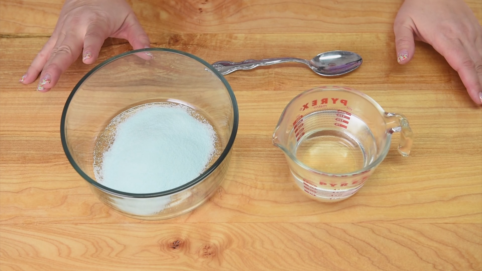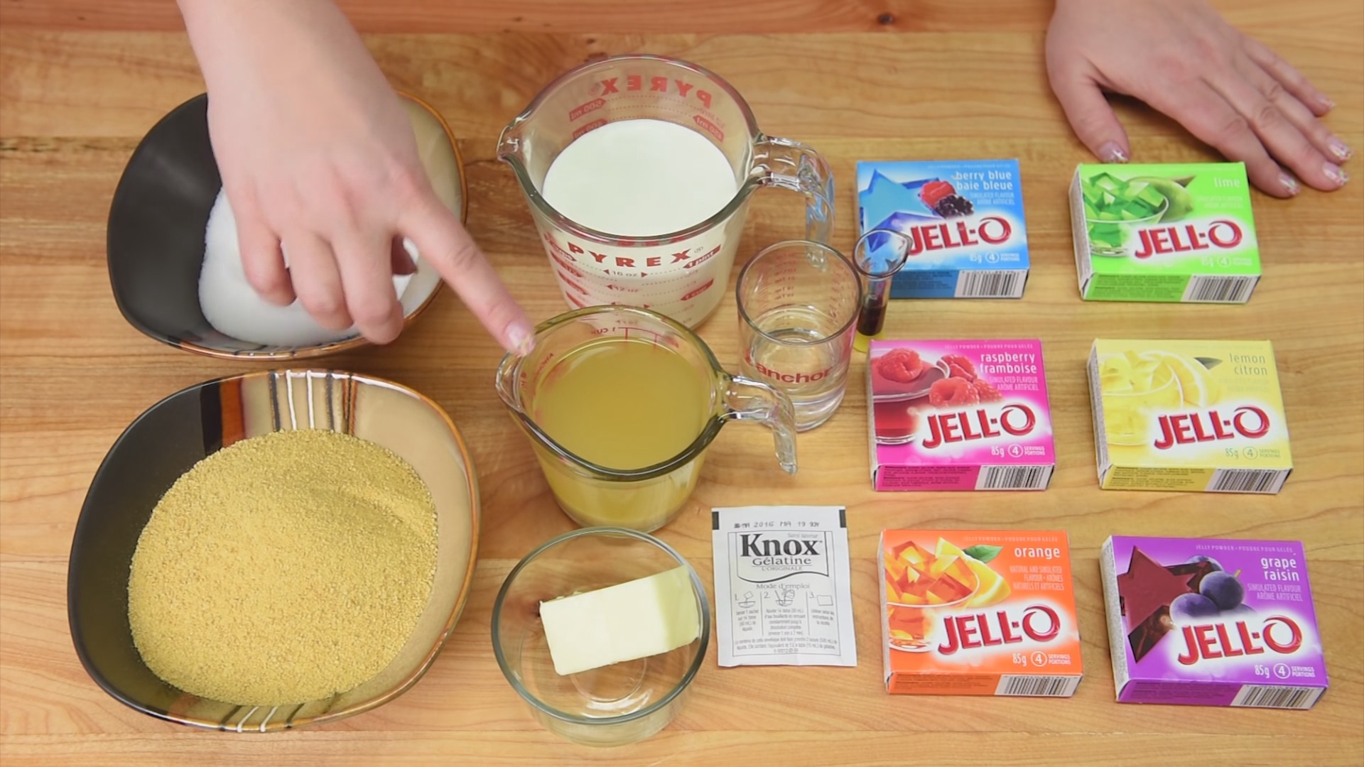 Zuerst mischt man das Pulver jeder Götterspeise in einzelnen Gefäßen mit dem Wasser, aber bitte wirklich nur jeweils mit den hier angegebenen 65 ml, weil wir eine festere Konsistenz als sonst brauchen.