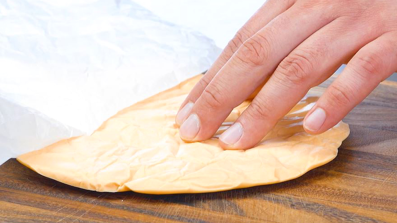 1. Beginne damit, das „Goldpapier“ herzustellen. Zerknülle dafür das Backpapier grob, falte es danach wieder auseinander und lege es ausgebreitet auf ein Brett.