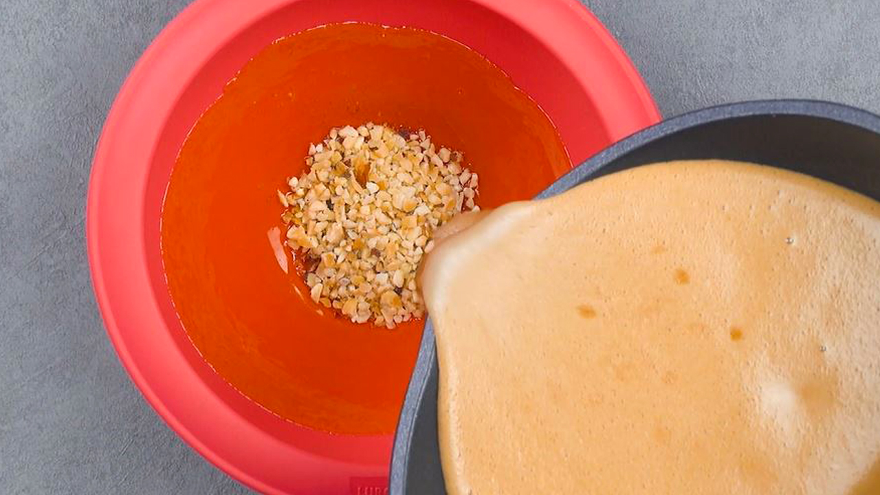 5. Stelle jetzt das Karamell her, indem du den Zucker mit dem Wasser in einen Topf gibst und zum Kochen bringst. Lass das Karamell bei mittlerer Hitze weiterkochen, bis es goldgelb geworden ist. Nimm den Topf dann vom Herd, lass ihn kurz abkühlen, gieße das Karamell in die Silikonform und kleide diese mit kreisenden Bewegungen damit aus. Fülle danach die gehackten Nüsse in die Mitte und lass das Karamell etwa 2 Stunden im Kühlschrank aushärten.