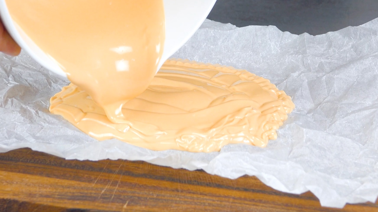 2. Temperiere nun die Kuvertüre, färbe sie mit der Lebensmittelfarbe ein und gieße die flüssige Kuvertüre so auf das Backpapier, dass ein Kreis entsteht.