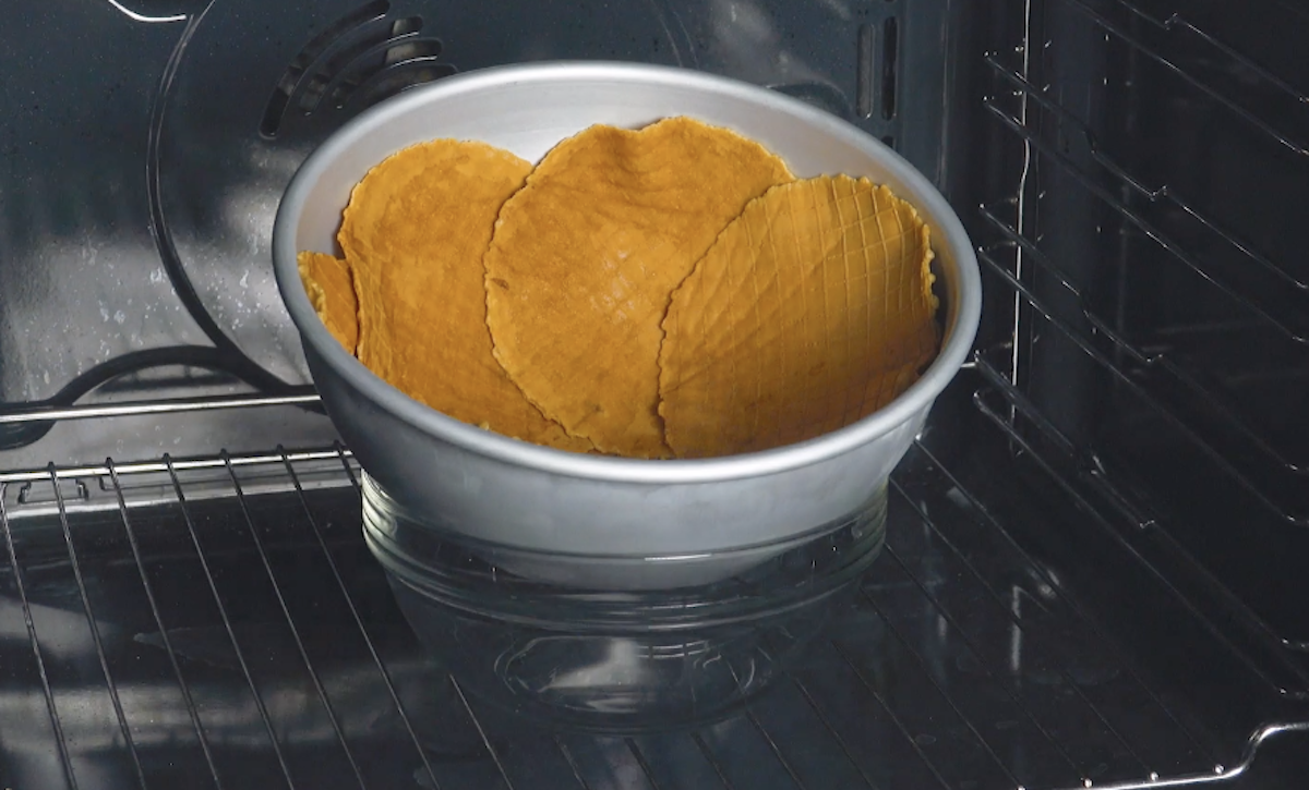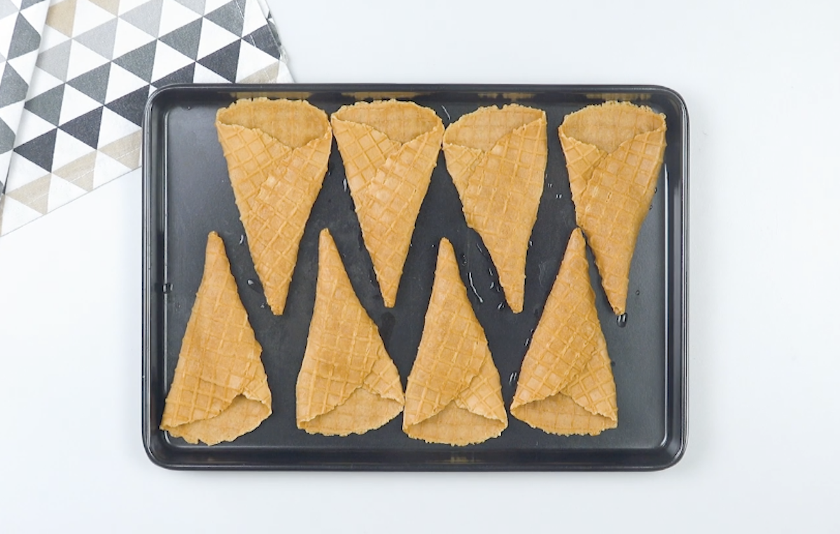 1. Heize den Ofen auf 170 °C Ober-/Unterhitze vor. Tauche dann die Eiswaffeln kurz in Wasser und lege sie auf ein großes Backblech. Backe die Waffeln ca. 2 bis 3 Minuten, bis sie zusammenfallen.