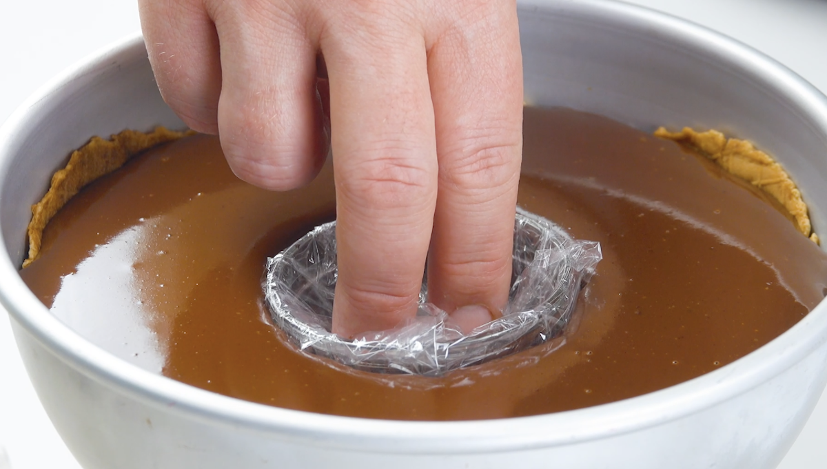5. Wickle zwei kleinere Schälchen in Frischhaltefolie ein und drücke je eines in die Mitte der mit Ganache gefüllten Schüsseln. Lasse diese dann mindestens 4 Stunden im Kühlschrank abkühlen.