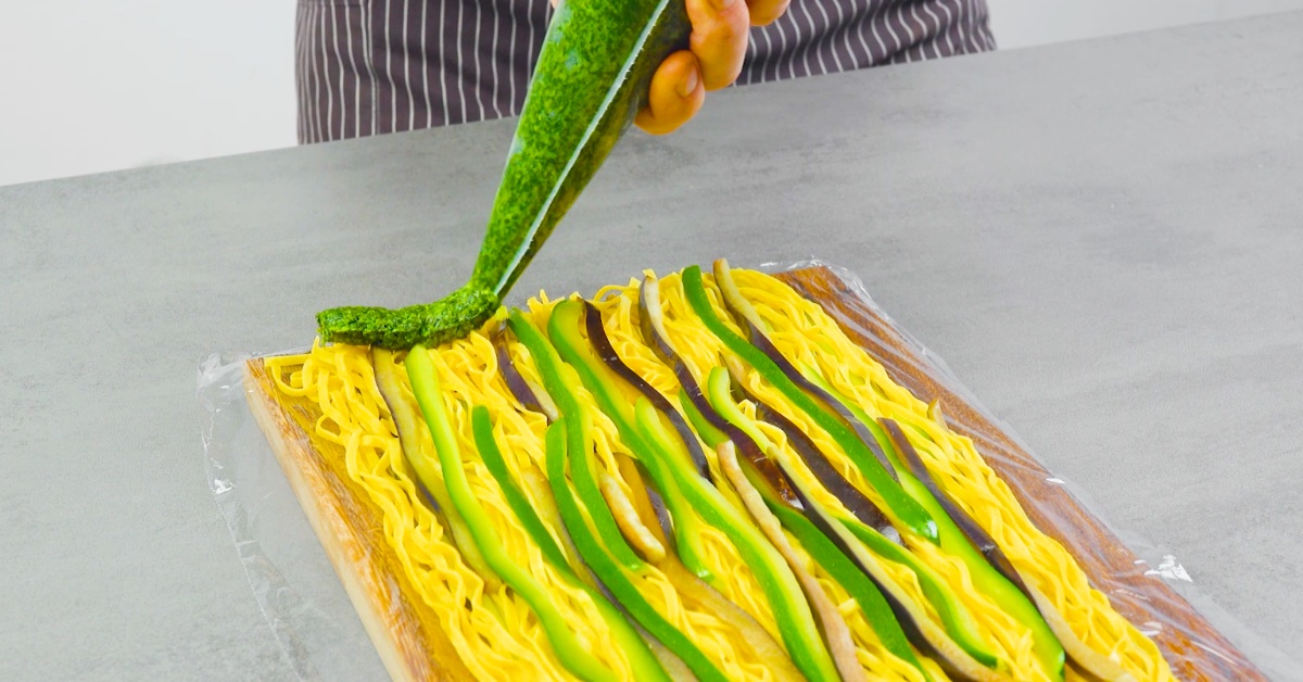 7. Fülle die Spinatpaste in einen Spritzbeutel und verteile sie gleichmäßig auf den Nudeln und den Gemüsestreifen.