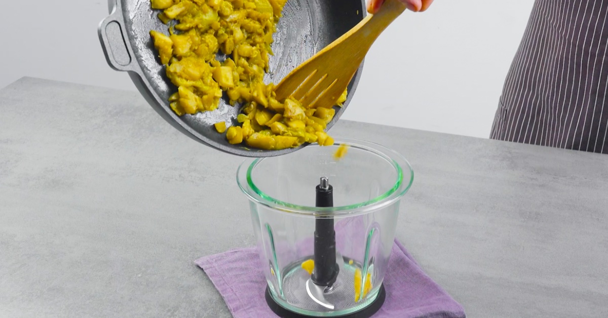 5. Fülle das Fruchtfleisch nach dem Abkühlen zusammen mit dem Spinat, den Eiern und der Knoblauchzehe in einen Mixer und mixe alles zu einer homogenen Paste. Schmecke diese mit Salz, Pfeffer und Muskatnuss ab.
