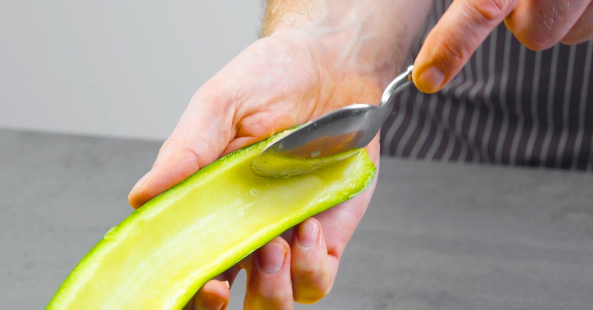 2. Halbiere nun die Zucchini und die Auberginen und höhle die Hälften mithilfe eines Löffels aus. Stelle das Fruchtfleisch beiseite und schneide die verbliebenen Gemüsehälften anschließend in schmale Streifen.