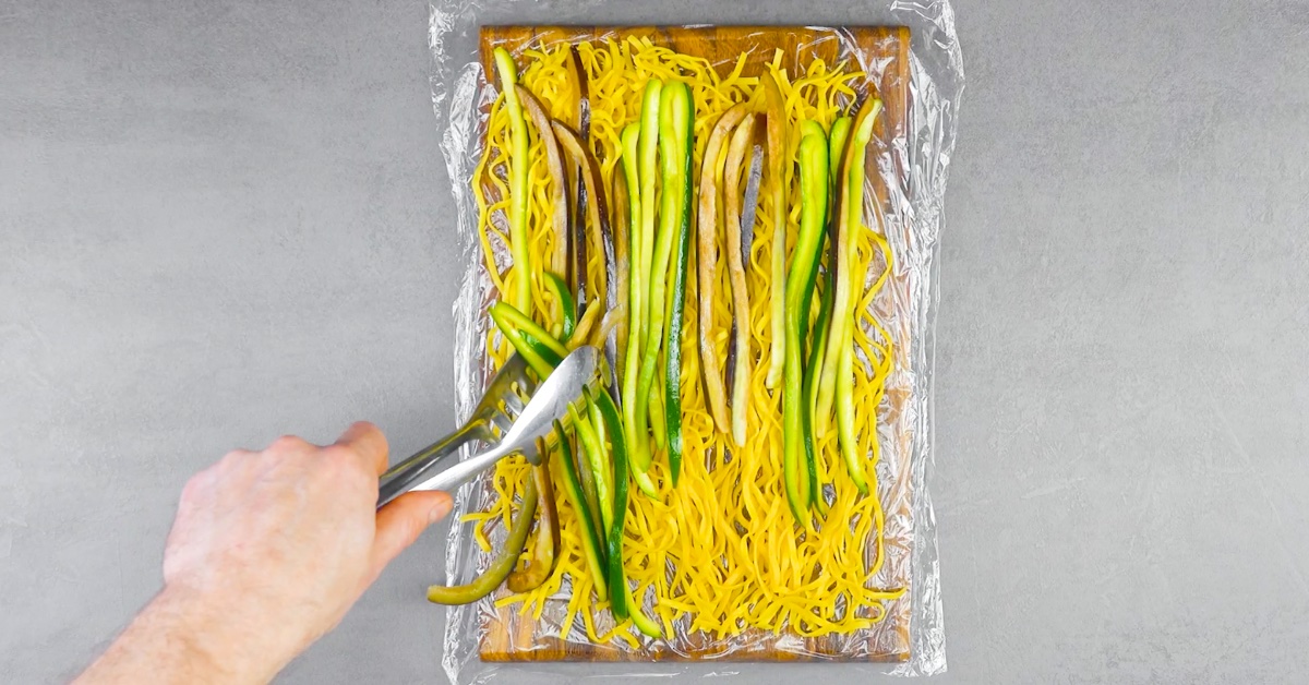 6. Lege die abgekochten Tagliatelle sowie die Gemüsestreifen nun der Länge nach auf ein Stück Klarsichtfolie.