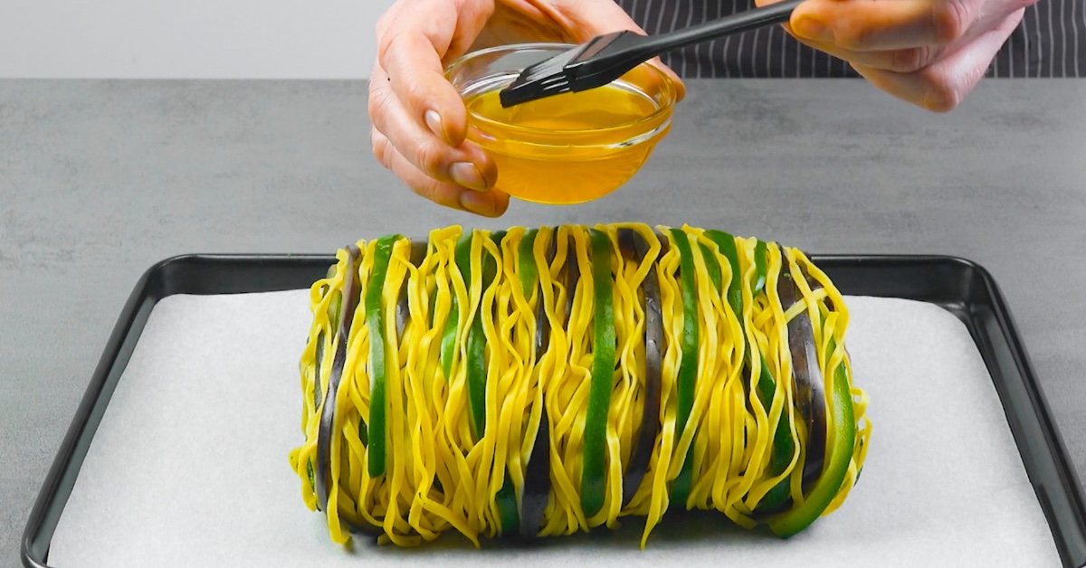 9. Platziere die Rolle danach auf ein mit Backpapier ausgelegtes Backblech, pinsele sie mit flüssiger Butter ein und gare sie für 30 Minuten im vorgeheizten Backofen bei 160 °C Umluft.