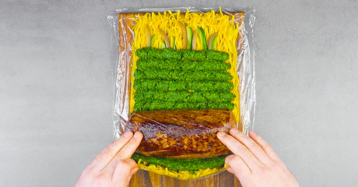 8. Lege zum Schluss auch das Rinderfilet quer darauf und rolle es in die Nudeln ein.