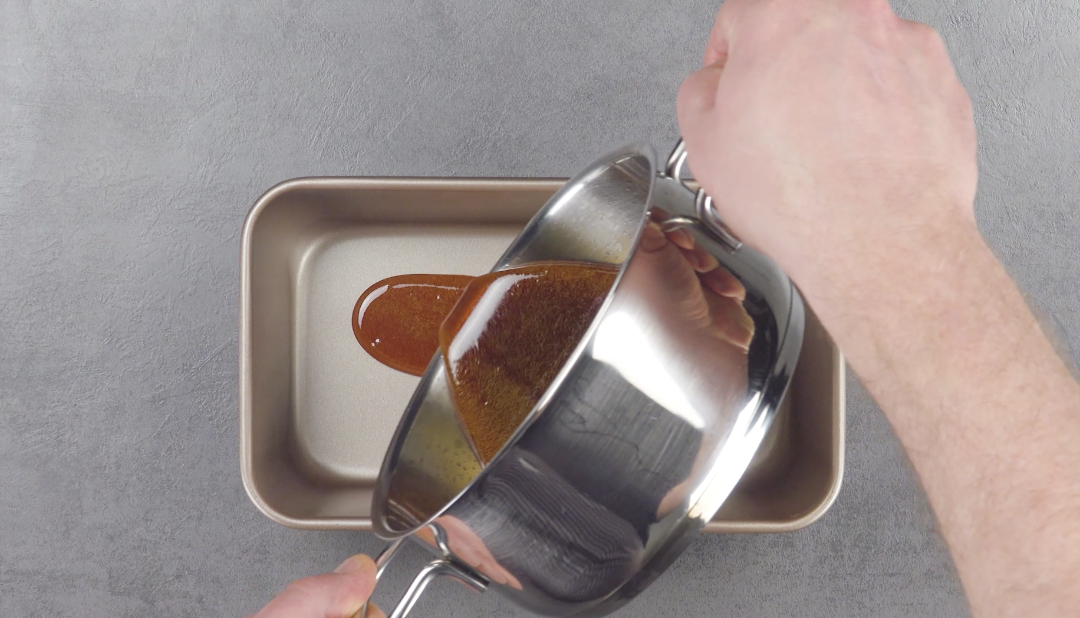 1. Als Erstes bereitest du das Karamell zu. Bringe Zucker mit Wasser in einem Topf zum Kochen und warte bis der Zucker braun ist und die typische Konsistenz von flüssigem Karamell hat. Gieße das Karamell in die Form und lasse es auskühlen.