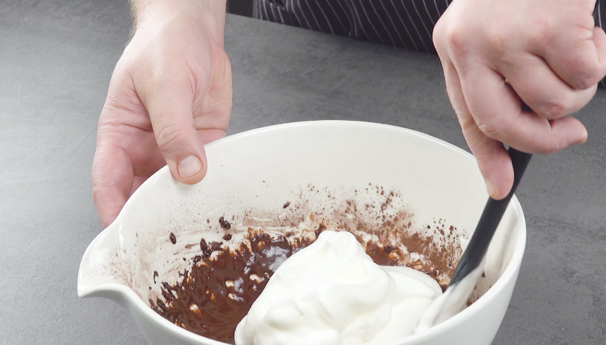 3. Für den Teigboden trennst du Eigelb und Eiweiß. Gib nun Mehl, Kakaopulver, Milch, Backpulver, Öl, Natron, Vanillearoma, Salz und Eigelb in eine Schüssel und verrühre alles mit einem Handrührgerät. Schlage Eiweiß mit Zucker in einer anderen Schüssel schaumig und hebe den Eischnee dann vorsichtig unter die Masse in der anderen Schüssel.