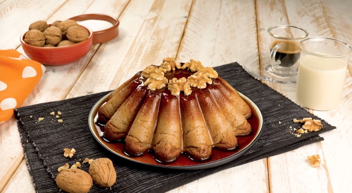 4.) Fülle die fertige Masse in die Puddingform, welche du in ein Wasserbad stellst. Hierzu eignet sich ein großer Topf oder eine größere Auflaufform. Nun muss der Flan bei 150 °C Umluft 90 Minuten gebacken werden. Wenn er fertig gebacken ist, stürze die Form mit Hilfe eines Tellers und ziehe die Puddingform vorsichtig ab. Garniere den Flan noch mit ein paar Walnusskernen.