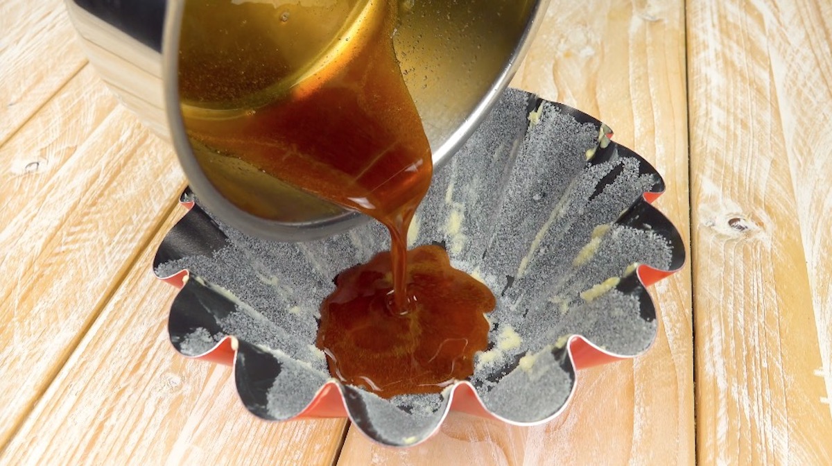 So geht es: 1.) Fette eine Puddingform mit einem Stück Butter gut ein. Gib dann den Zucker in die Form und schwenke diese sachte hin und her, bis die Butter komplett mit Zucker „beklebt“ ist. Den überschüssigen Zucker schüttest du in einen Topf.