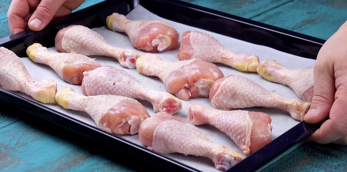 1.1) Lege die Hähnchenkeulen auf ein mit Backpapier ausgelegtes Blech und würze sie mit Salz und Pfeffer. Gare sie dann für 30 Minuten bei 150 °C Umluft.