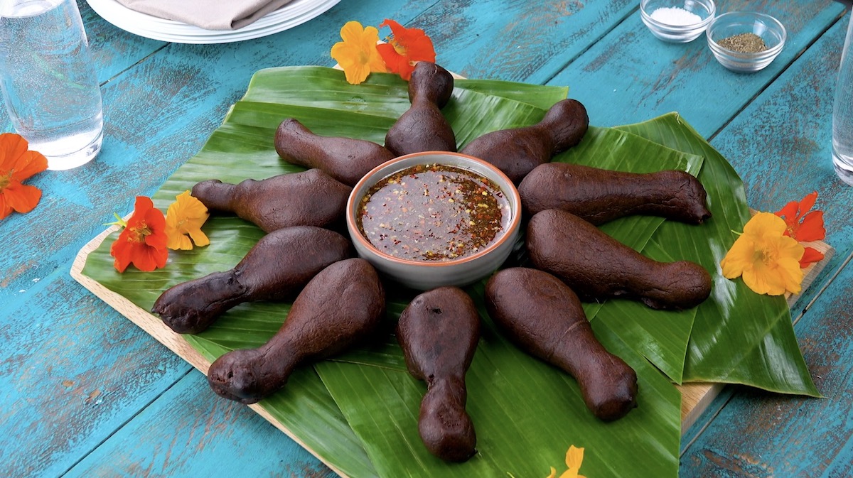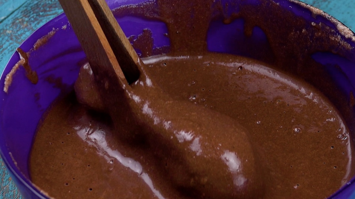 1.2.) Bereite den Ausbackteig zu, während die Hähnchenkeulen abkühlen. Trenne dafür zunächst die Eier. Verrühre dann das Eigelb mit Milch, Kakao, Puderzucker, Mehl und Sonnenblumenöl. Schlage anschließend das Eiweiß mit einer Prise Salz steif und hebe es unter den Teig. Tauche mit einer Zange die Hähnchenkeulen in den Schokoladenteig.