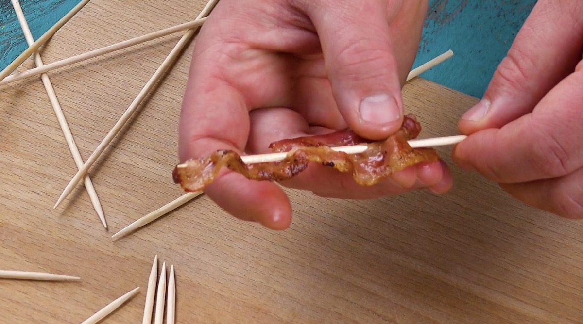 2.1) Brate den Bacon von beiden Seiten goldbraun an. Warte, bis die Scheiben handwarm sind und stecke sie dann auf Holzspieße.