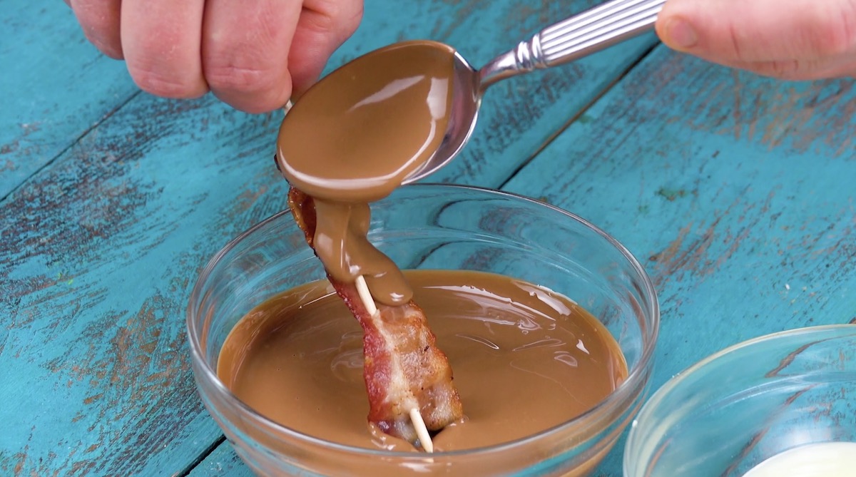 2.2) Schmilz die Schokoladen im Wasserbad. Rühre in jede Schokoladensorte 1 TL Kokosöl. Überziehe den Bacon dann zunächst komplett mit Vollmilchschokolade.