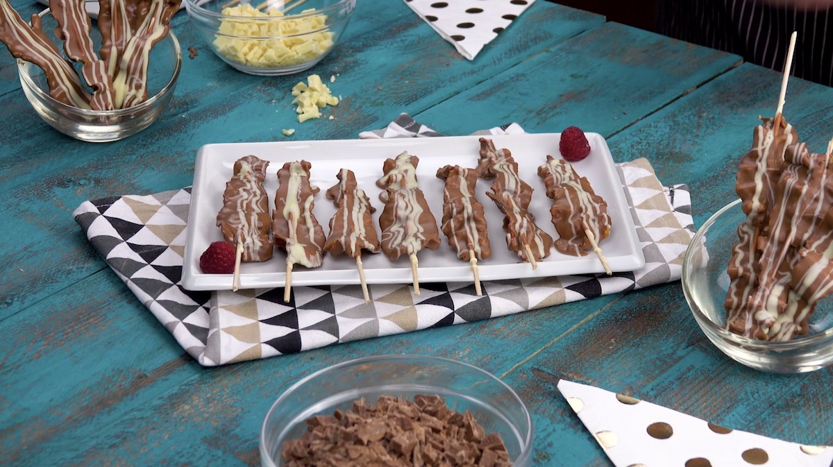 2.3) Verziere den Bacon abschließend mit weißer Schokolade. Stelle ihn vor dem Servieren kurz in den Kühlschrank, damit die Schokolade fest werden kann.