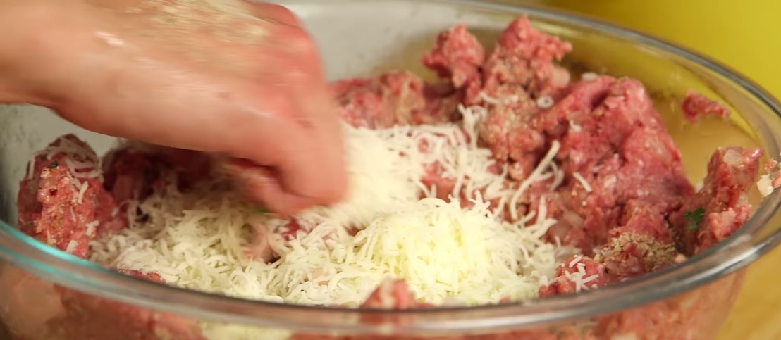Jetzt ist es Zeit für die Frikadelle. Vermische in einer Schüssel das Hackfleisch mit den Zwiebeln, der Petersilie, den Eiern und dem Knoblauch.