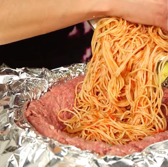 Als nächsten Schritt kleidest du eine ofengeeignete Schüssel mit Alufolie aus. hier kommen die restlichen zwei Drittel vom Fleisch hinein. Forme jetzt eine innere „Tasche“ im Fleisch – hier kommen die Nudeln hinein. Achte darauf, dass die die Seiten eher etwas dicker sind, sonst fällt vielleicht alles auseinander.