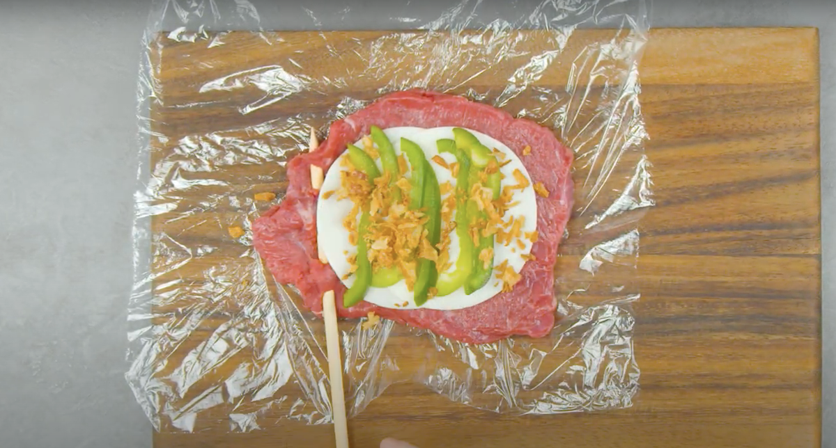 3.2 Belege das Rindfleisch nun mit dem Provolone, der grünen Paprika und den Röstzwiebeln. Rolle das Ganze wieder eng zu einer Fleischroulade zusammen und friere die Rinderroulade am Spieß für 1 1/2 Stunden ein.