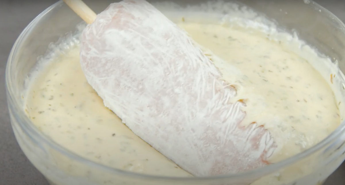 2.3 Nimm wieder eine der bereits vorbereiteten Schüsseln mit dem Backteig und füge dieses Mal 2 TL italienische Kräuter und 2 TL geriebenen Parmesan hinzu. Ziehe den gefrorenen Schweinerouladen-Spieß wieder erst durch das Mehl, dann durch den Backteig und frittiere ihn bei 150 °C im Fett schwimmend für circa 6-7 Minuten.