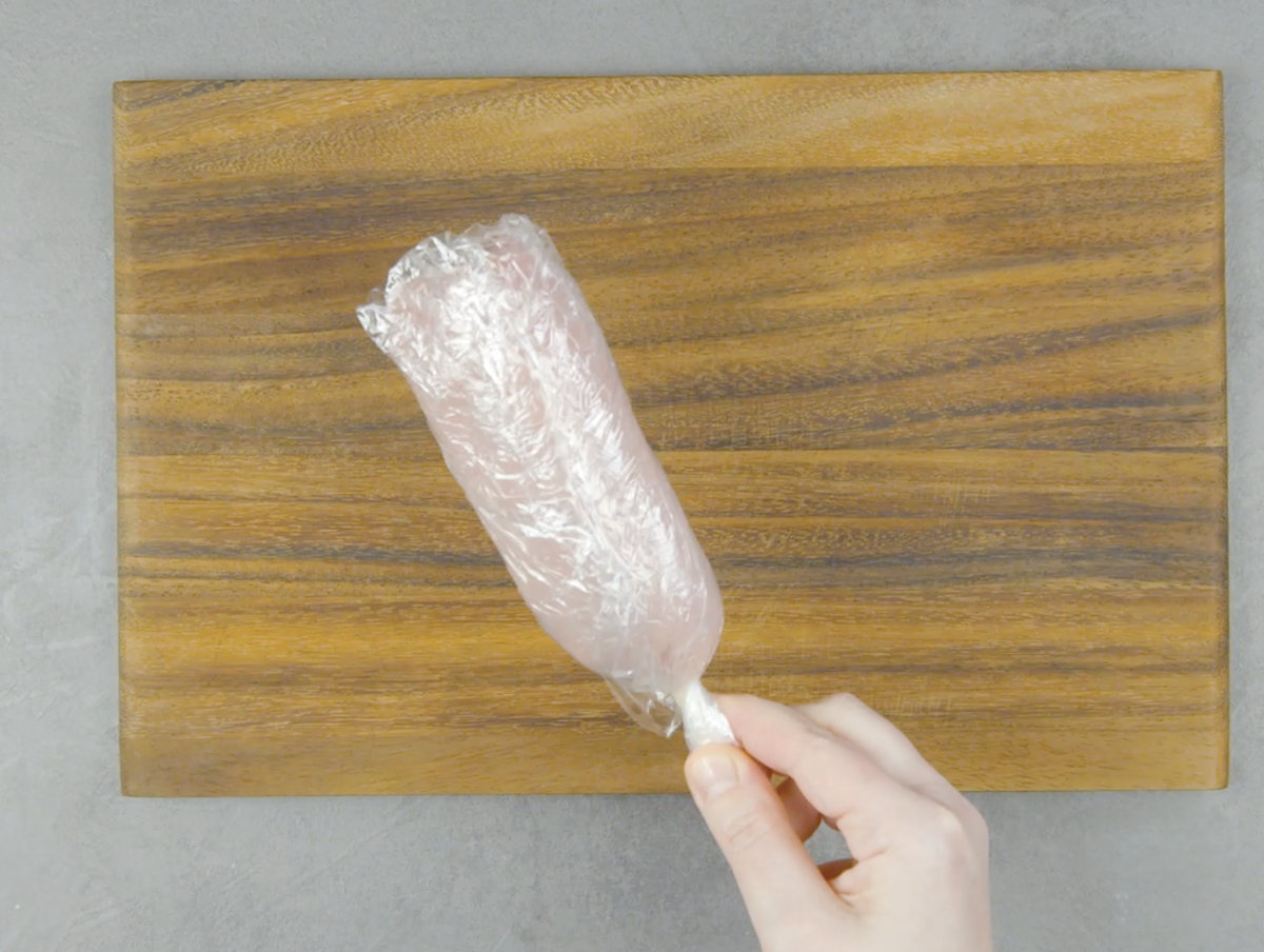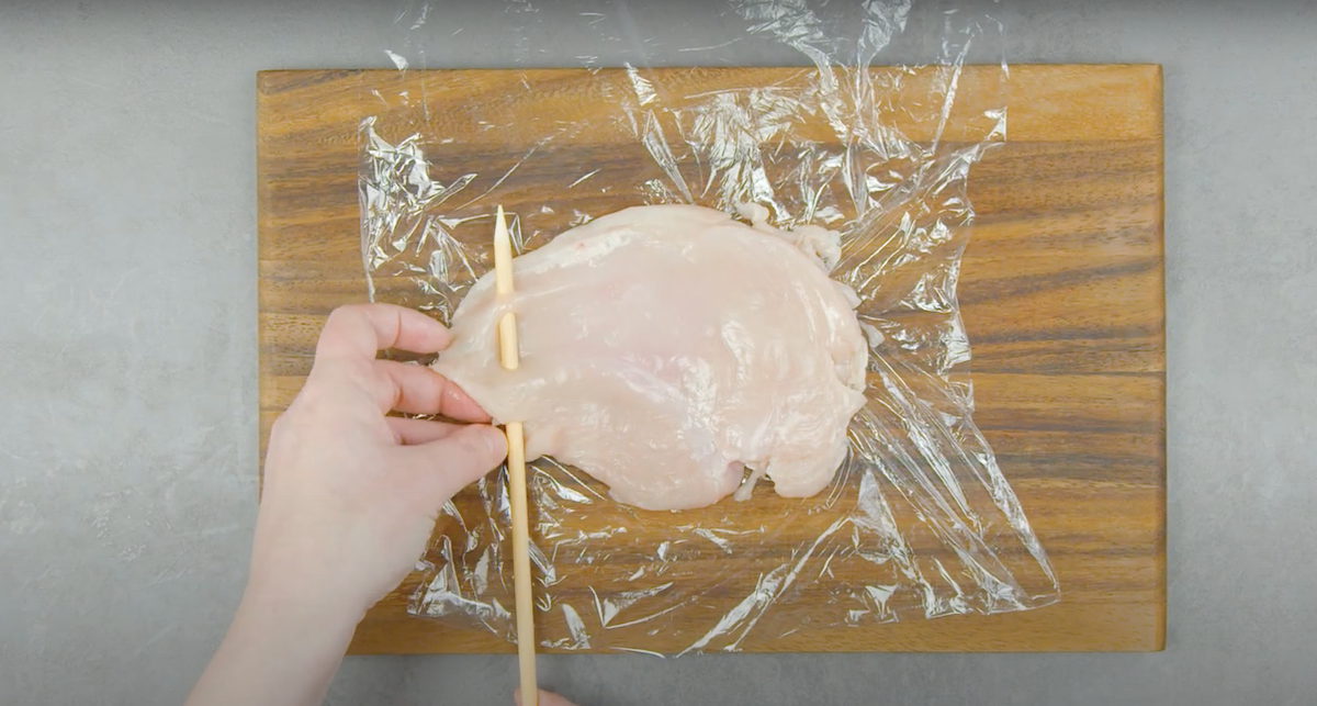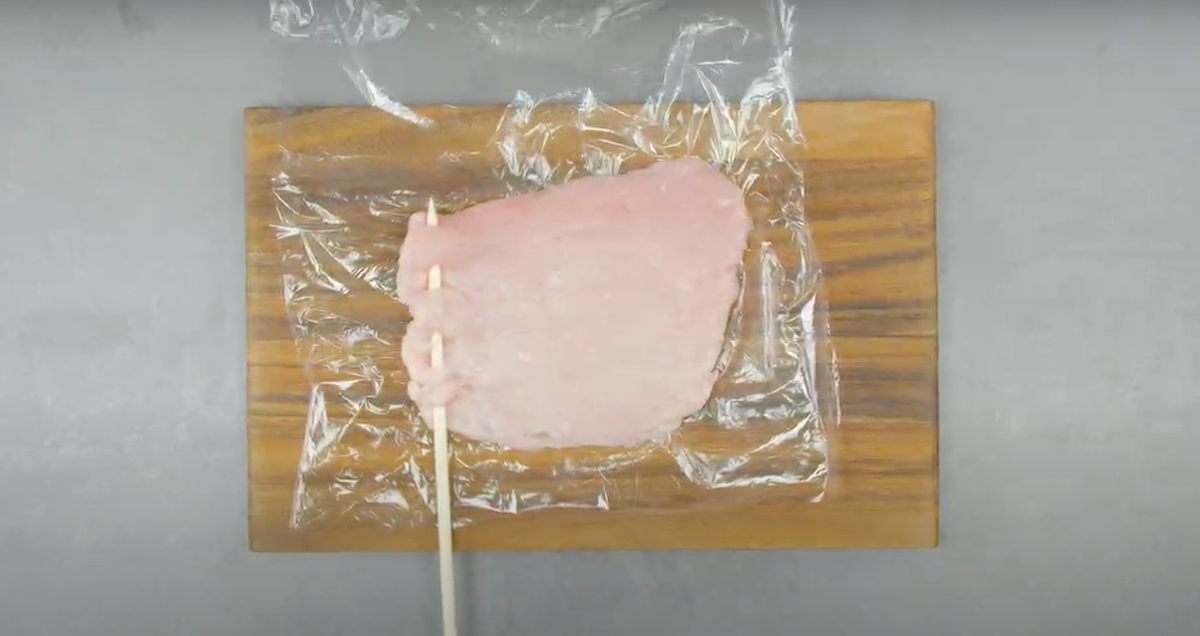 1.1 Lege die Hühnerbrust zwischen zwei Lagen Klarsichtfolie und schlage sie mit einem Fleischhammer gleichmäßig platt. Ziehe die obere Folie wieder ab und würze das Hühnerfilet mit Salz und Pfeffer. „Fädle“ den Spieß auf der linken Seite durch das Fleisch.