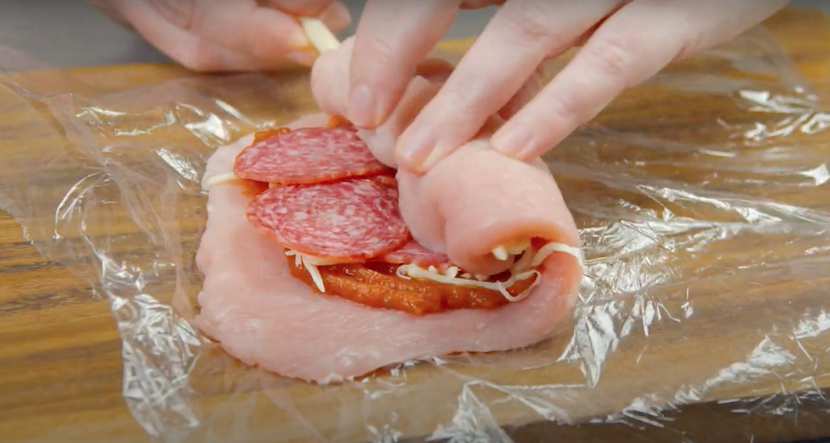 2.2 Bestreiche den Schweinerücken mit der Tomatensauce. Verteile darauf den geriebenen Mozzarella und vollende das Ganze, indem du die Salamischeiben darauflegst. Rolle das Fleisch erneut von der linken Seite aus eng ein, packe die Schweineroulade auch hier wieder wie ein Bonbon in die Klarsichtfolie ein und gib sie für 1 1/2 Stunden ins Gefrierfach.