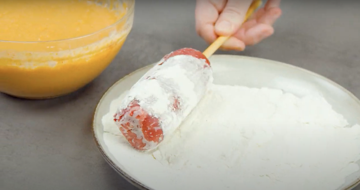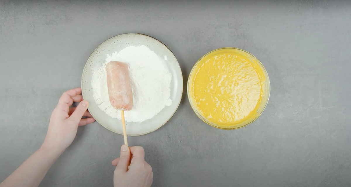 3.3 Nimm ein letztes Mal eine der bereits vorbereiteten Schüsseln mit dem Backteig und füge in diesem Fall 2 TL Zwiebelpulver und 1 TL geräuchertes Paprikapulver hinzu. Ziehe den gefrorenen Rinderrouladen-Spieß wieder erst durch das Mehl, dann durch den Backteig und frittiere ihn bei 150 °C im Fett schwimmend für circa 6-7 Minuten.